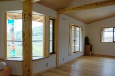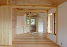 床は杉板t30本実、壁・天井は漆喰塗り(杉の小片入り)