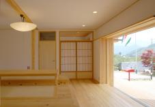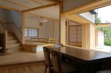 畳で板の間より40cm上がり堀炬燵のようになっています。居間正面はウッドデッキテラスで庭と繋がり掃き出し窓は引き込まれて、写真のように大らかな開口部となります。