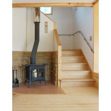 土地の形状・高低差と周囲の建物との関係からL型形状の計画案を提案。夏の日差しを遮り、冬の日差しを取入れることと、太陽熱の利用・雨水の利用をしています。エアコンは無く薪ストーブと床下FF暖房による床暖房としています。2階の暖気をダクトとファンで1階床下に送風しています。